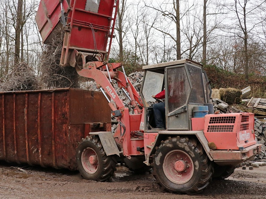 ATLAS 52E mit einem Einsatzgewicht von 4,5 to. 3-Wegeschaufel und Palettengabel